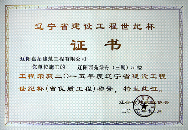 • 2015年遼寧省建設(shè)工程世紀(jì)杯(企業(yè)獎(jiǎng))